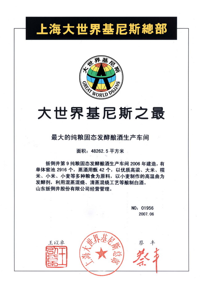 近日,经大世界基尼斯总部严格的审核确认,山东扳倒井集团第九纯粮固态发酵酿酒生产车间,打破了大世界基尼斯纯粮固态发酵酿酒生产车间规模记录,比原来记录提高近一倍,符合在该领域内“第一”的特征,成为目前全世界最大的纯粮固态发酵酿酒生产车间。