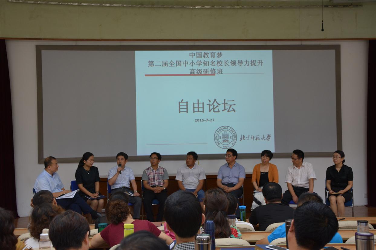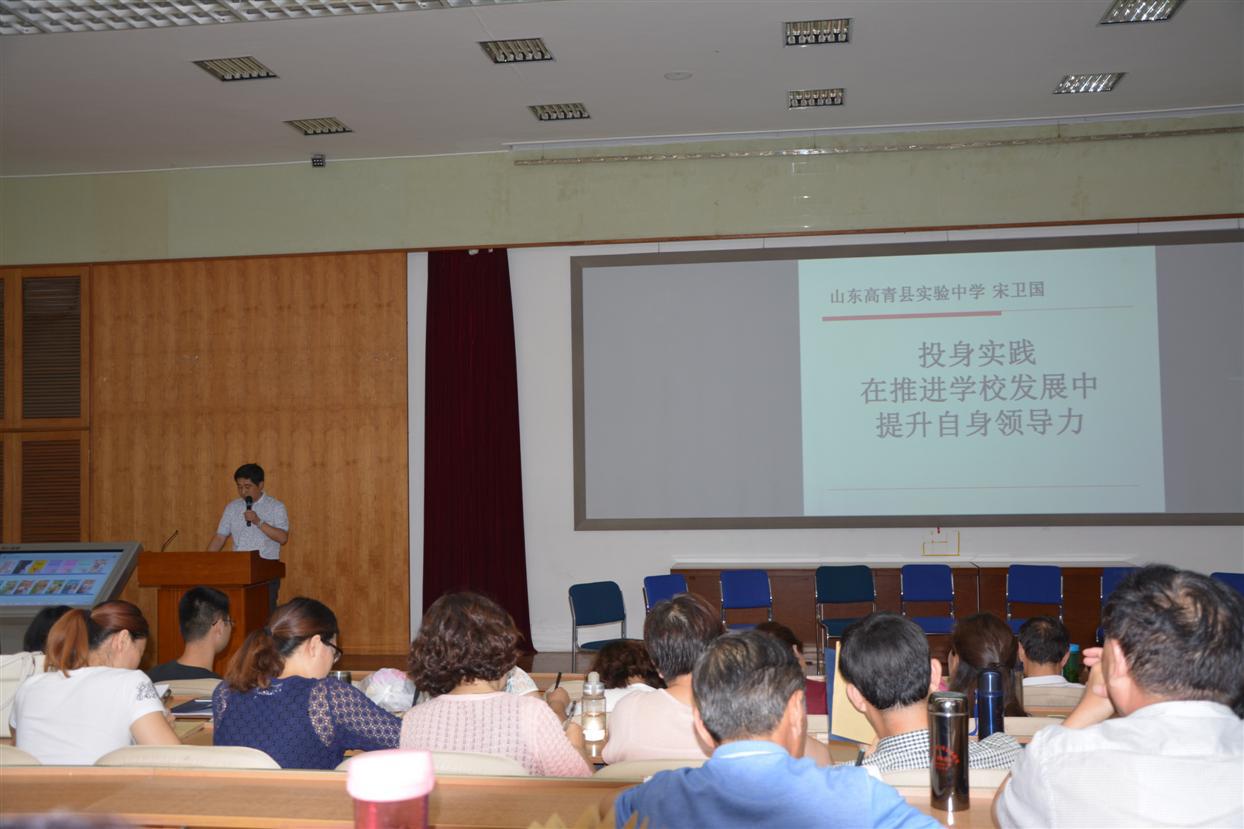 培训课程中,《曾国藩的修身与用人方略》、《儒家文化解说》两场报告分别由中央电视台百家讲坛特约嘉宾林乾教授和主讲嘉宾方尔加教授主讲,两位教授结合我国古今名人故事与国学传统文化发展,给我们介绍了曾国藩的修身、识人与用人智慧以及世界主流文化——儒家文化的修身之道、中庸之道和管理之道。北师大陈飞星博士的体验式课程使参训者记忆犹新,陈博士结合《校长领导力提升与团队管理建设方案建设》组织带领参训校长进行体验式训练,通过“群口相声”的游戏形式使我们充分认识到了创新意识、常规落实和团队合作的作用和力量,在欢乐祥和的气氛中获得了知识,收到了启迪,令人久久不忘。著名心理咨询师马健教授的《心灵光合作用》、北师大赵德成博士的《有效课堂教学的反思与改进》、国家行政学院胡冶岩教授的《认识领导角色,提升领导能力》、全国名校长王建宗教授的《校本课程开发与实施》、全国知名教师培训专家,海淀区教育党校汪志广校长的《当好一把手的领导策略》等课程,都非常精彩,从不同的视角给我们以思想的洗礼和可操作化的指导。另外,还实地考察了北京师范大学第二附属中学,并聆听了该校物理学科教师的一次专题报告。培训最后半天,由北师大资深教师培训课程设计专家,本次培训项目负责人张超主任主持召开了研修论坛。本次论坛共推选出参训学员中7个地区的8位校长参加,我县推举实验中学副校长宋卫国参加了论坛。宋校长在主题论坛上以“投身实践,在推进学校发展中提升自身领导力”为题作了精彩发言,宋校长在发言中对参加培训班取得的收获进行了总结,同时结合我县及学校开展的教学改革实际,对近几年高青教育取得的成绩作了概括性介绍。其发言底气足,内容实,得到主持人的高度赞赏,赢得了全体学员的阵阵掌声。在自由论坛阶段,主持人就感兴趣的教学改革话题对宋校长进行了“重点采访”,使宋校长的发言时间几乎占了自由论坛总时间的三分之一,这也从侧面反映出我县教学管理及教学改革的一些成功做法得到了有关专家及同仁的关注和认可。