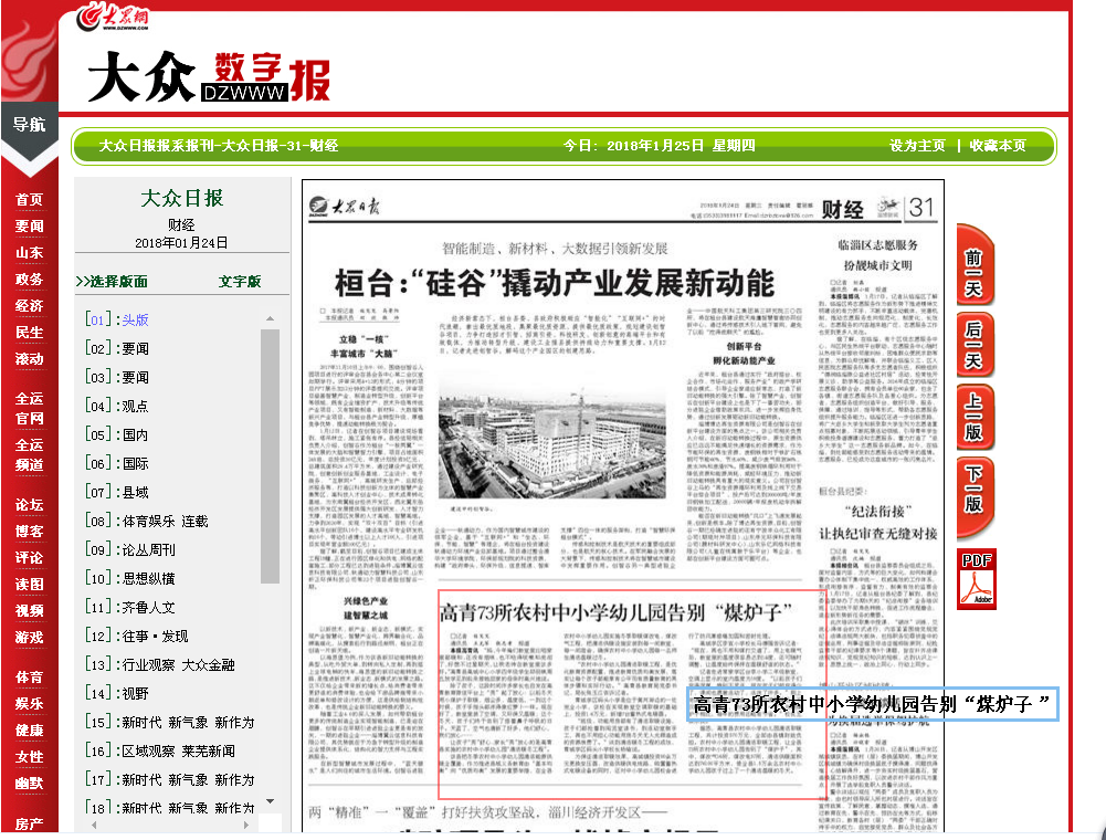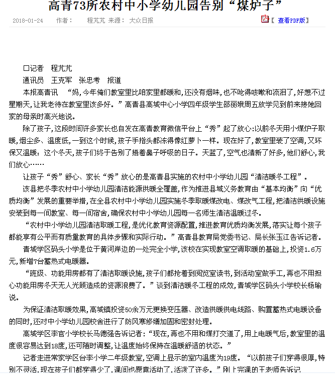 1月24日,《大众日报》刊发我县教育新闻《高青73所农村中小学幼儿园告别“煤炉子”》,报道我县在农村中小学幼儿园清洁取暖工程方面取得的成绩。