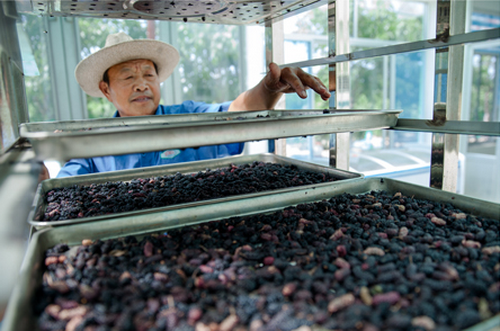 菁盛农业发展有限公司大棚里的桑蚕 工人在菁盛农业发展有限公司准备烘烤加工蚕茧 工人在和润丝绸公司车间搬运准备烤制的桑叶茶 工人在和润丝绸公司包装下线的桑葚酵素 工人在和润丝绸公司蒸馏车间查看桑葚酒质情况 小朋友在常家镇老郑家庭农场采摘品尝桑葚鲜果 工人在菁盛农业发展有限公司加工桑葚干
