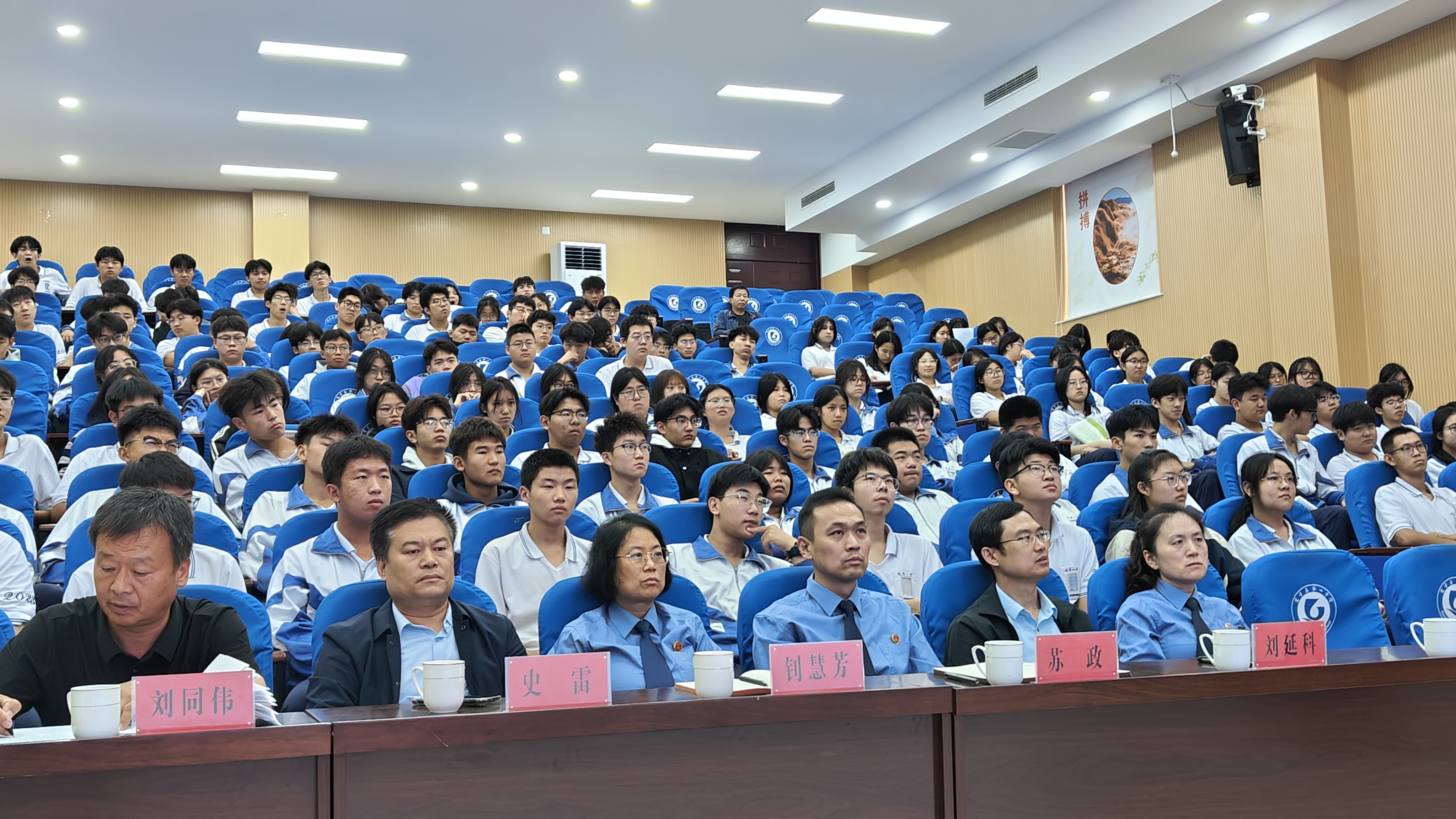 高青县人民检察院党组书记、检察长苏政;高青县委教育工委常务副书记、县教体局党组书记、局长刘延科;高青县人民检察院党组成员、副检察长钊慧芳,党组成员、专委李银萍,第一检察部副主任徐国栋;高青一中党委副书记、副校长史雷,党委委员刘同伟,300余名师生参加活动。