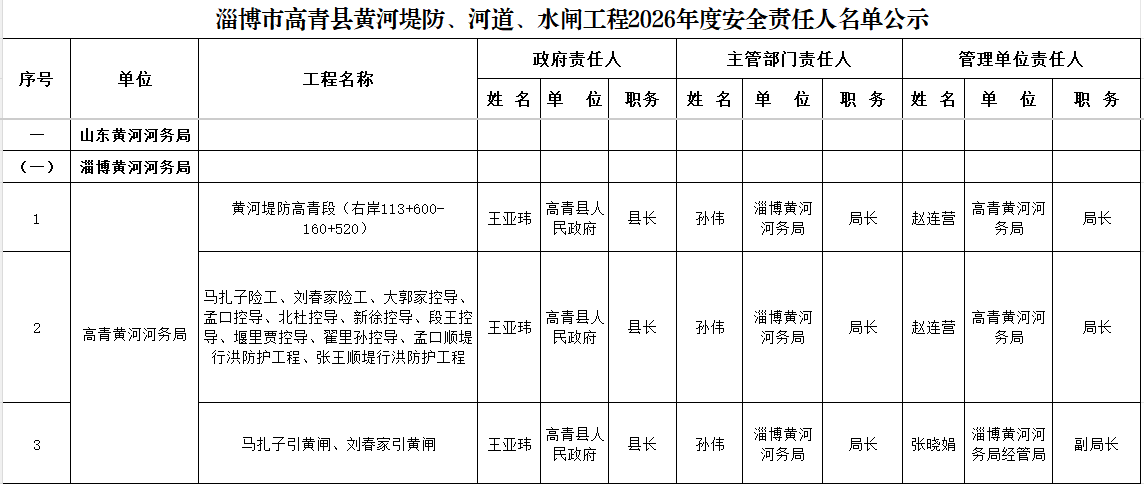 淄博市高青县黄河堤防、河道、水闸工程2026年度安全责任人名单公示