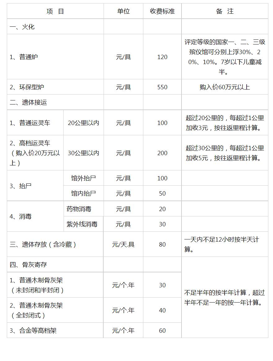 高青县殡葬基本服务项目及收费标准表