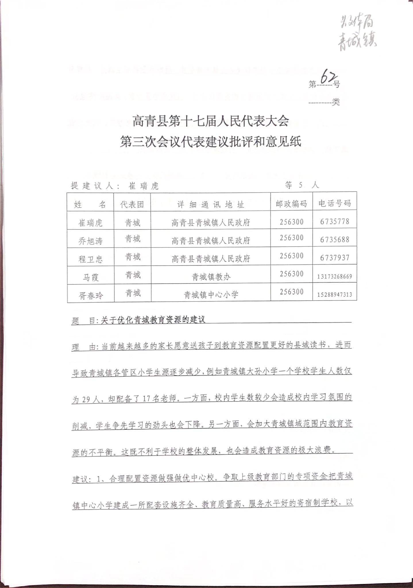 崔瑞虎、乔旭涛、程卫忠、马霞、胥春玲代表: