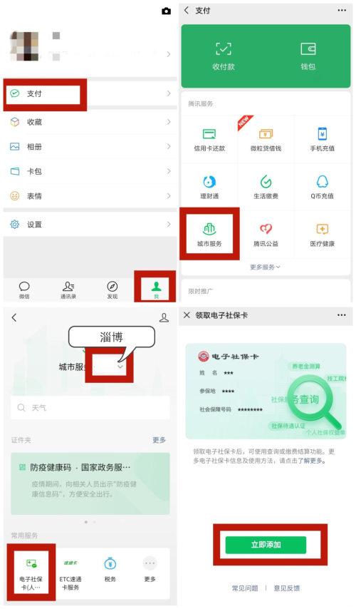 1.微信-右下角“我”-“支付”-“城市服务(淄博)”-“电子社保卡”。