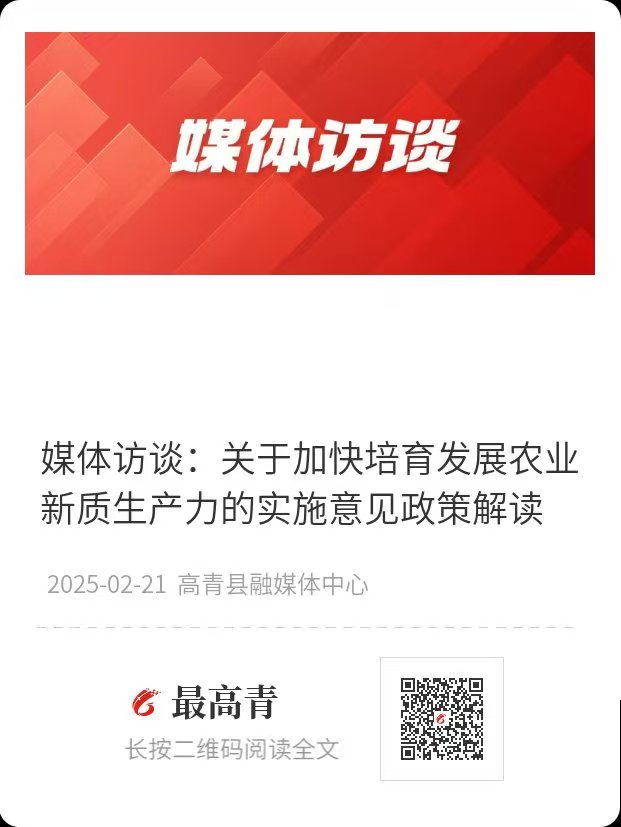 各位网友,大家好。日前,我县印发了《关于加快培育发展农业新质生产力的实施意见》(以下简称《实施意见》),引起了社会各界的关心和关注。今天,我们非常荣幸能够邀请到高青县农业农村局党组书记、局长申彩虹,就《实施意见》的有关内容进行详细解读。