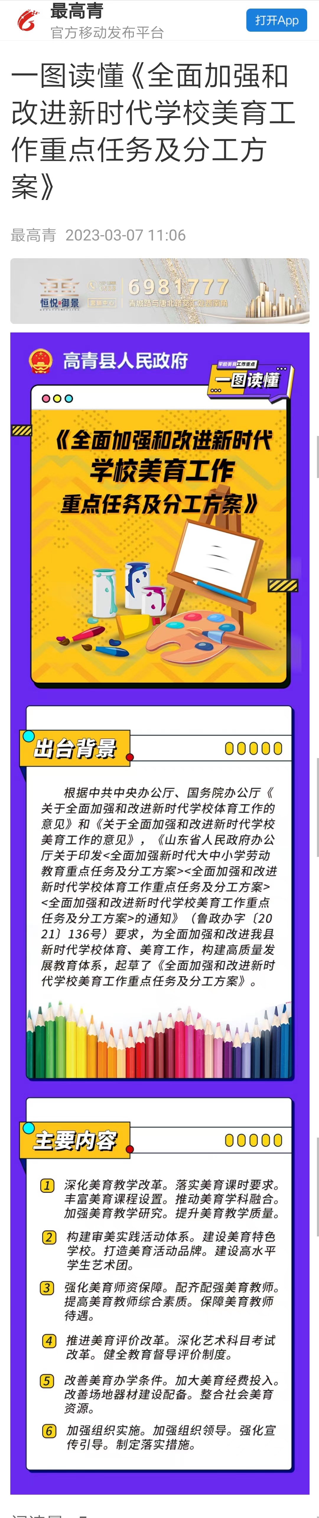 2023年3月7日,“最高青”客户端发布《一图读懂<全面加强和改进新时代学校美育工作重点任务及分工方案>》,点击本段文字可查看详情。