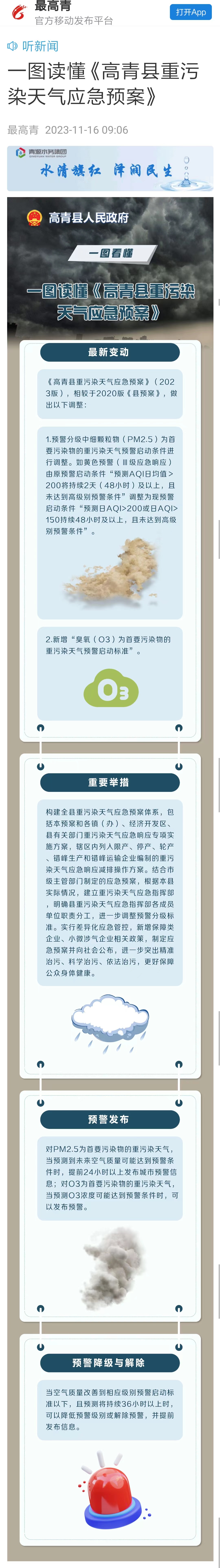 2023年11月16日,“最高青”客户端发布《一图读懂<高青县重污染天气应急预案>》,点击本段文字可查看详情。