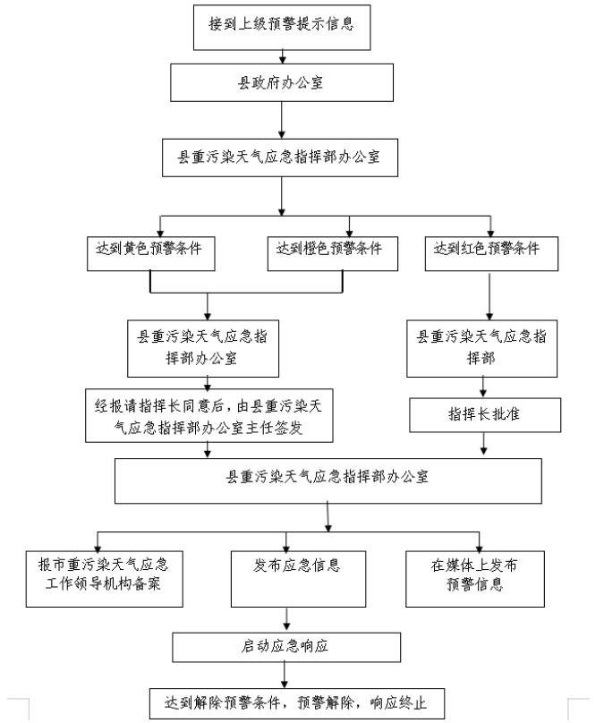 接到市政府发布预警指令后,县重污染天气应急指挥部办公室按照发布预警级别和权限,报请县重污染天气应急指挥部指挥长或县重污染天气应急指挥部办公室主任批准签发后发布。红色预警由县重污染天气应急指挥部指挥长签发,橙色、黄色预警经报请指挥长同意后,由县重污染天气应急指挥部办公室主任签发。