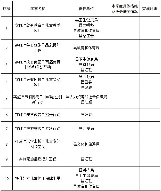 县直有关部门要结合实际,尽快制定实施方案,明确责任科室、责任人,建立工作台账,确保实事项目高标准、高质量完成。各责任单位要于每季度末将实事进展情况电子版及盖章PDF版报县妇儿工委办公室(联系电话:6967116,协同办公邮箱:高青县妇联)。
