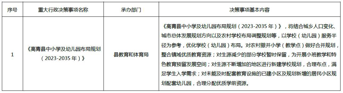 高青县人民政府办公室关于公布高青县人民政府2023年度重大行政决策事项目录的通知