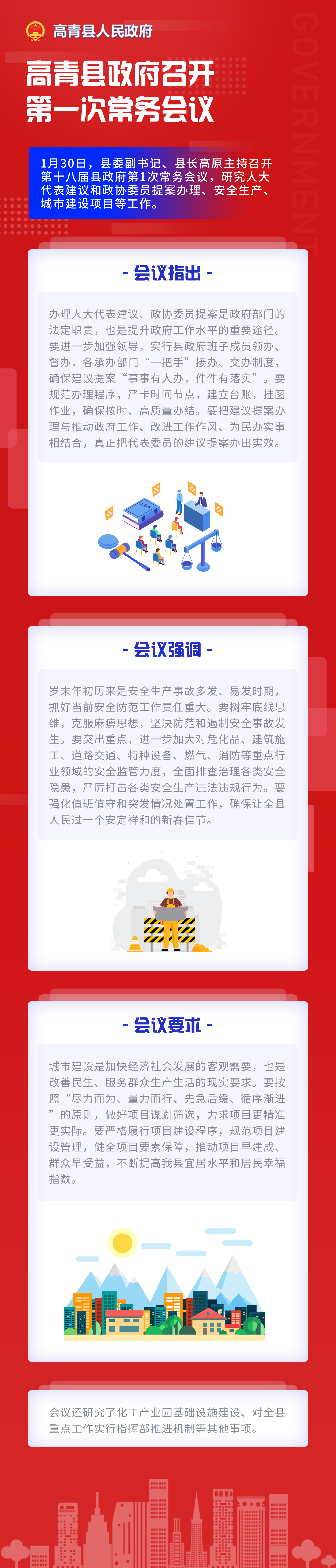 1月30日,县委副书记、县长高原主持召开第十八届县政府第1次常务会议,研究人大代表建议和政协委员提案办理、安全生产、城市建设项目等工作。