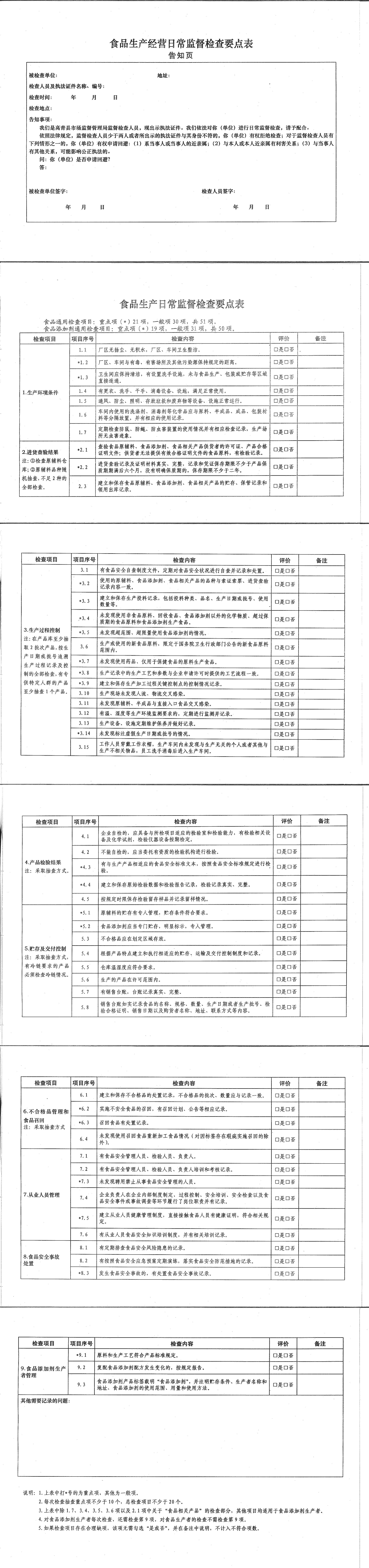 高青县食品生产经营日常监督检查标准