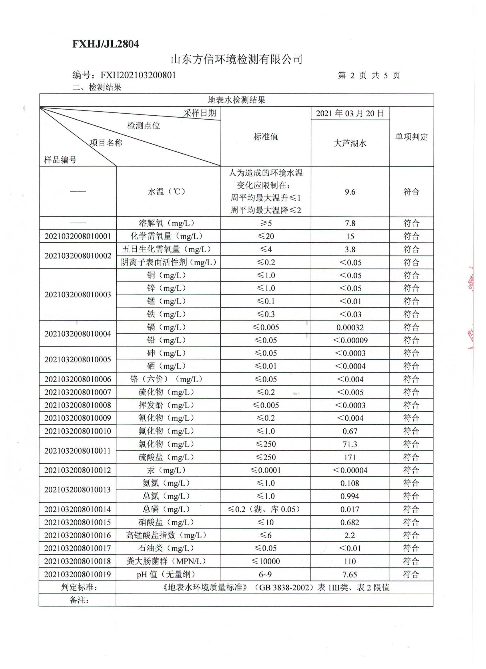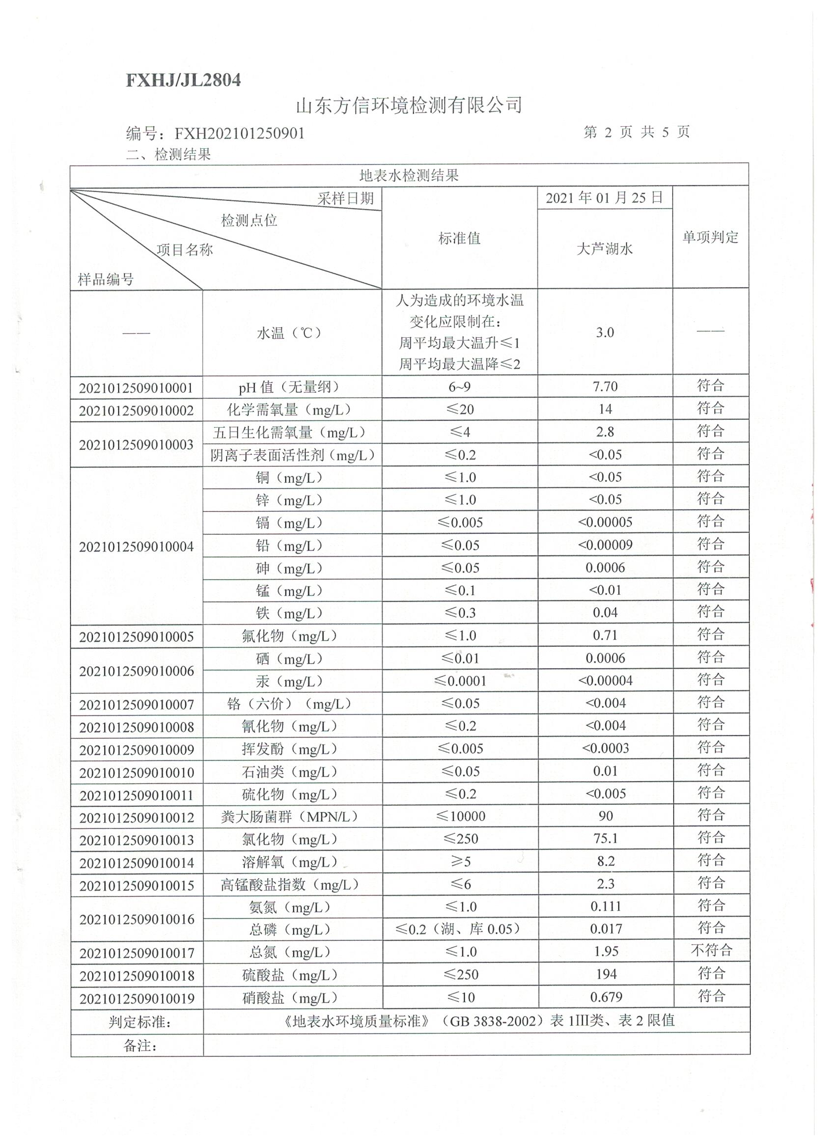 高青县大芦湖水库饮用水水源地水质情况公示(第一季度)