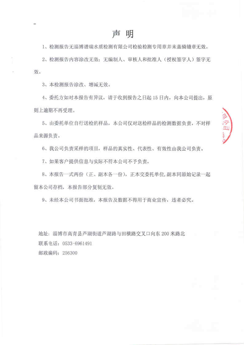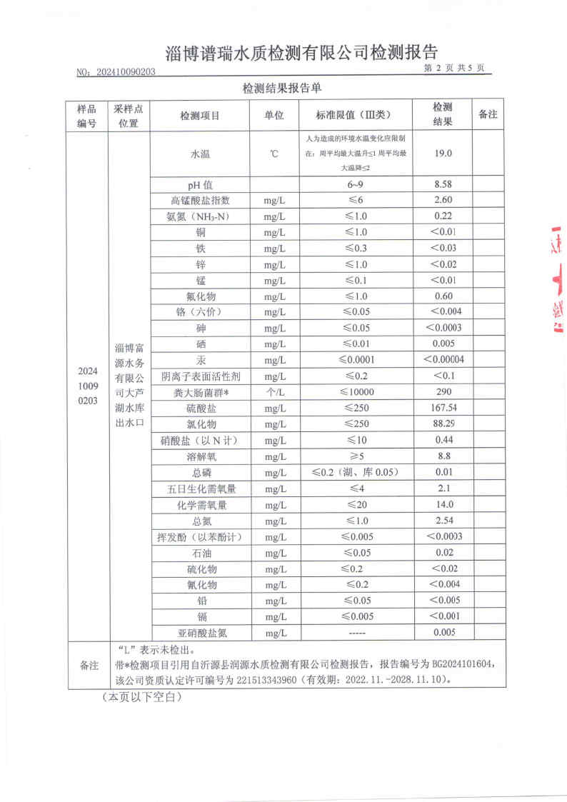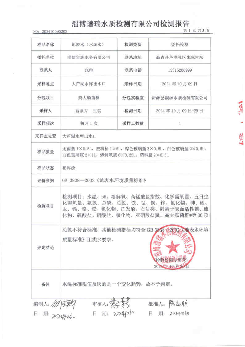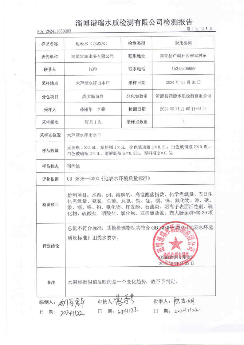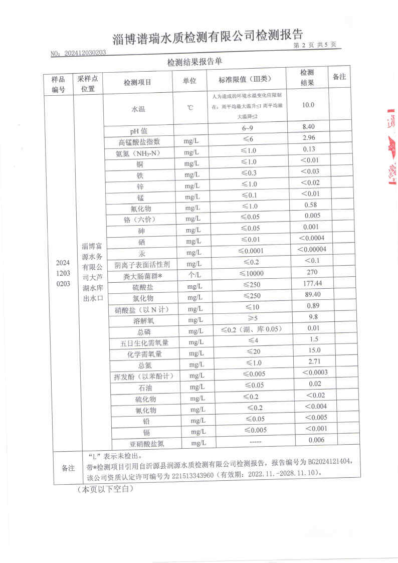 高青县大芦湖水库饮用水水源地水质情况公示(第四季度)