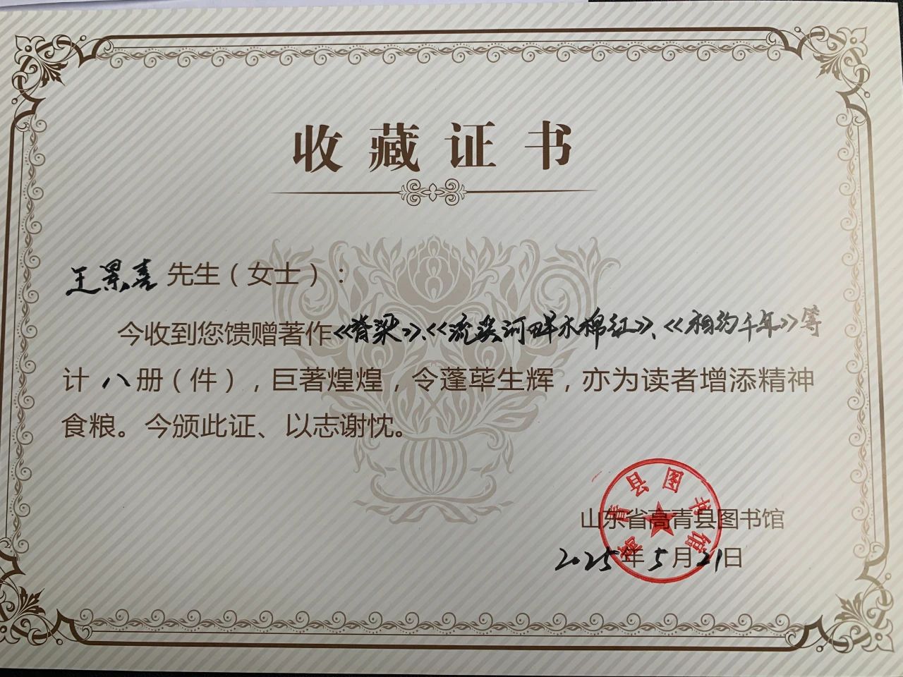近日,高青籍著名作家王景喜先生将自己出版的心血之作《脊梁》《流溪河畔木棉红》《破译生命密码》《相约千年》《青春不留白》共计五种八册,捐赠给县图书馆 ,为家乡的文化事业注入新的活力。县图书馆对王景喜先生的捐赠表示衷心的感谢,这些图书分类整理上架供读者借阅,也希望更多的本土作家与图书馆联系与合作,共同推动地方文化事业的繁荣发展。