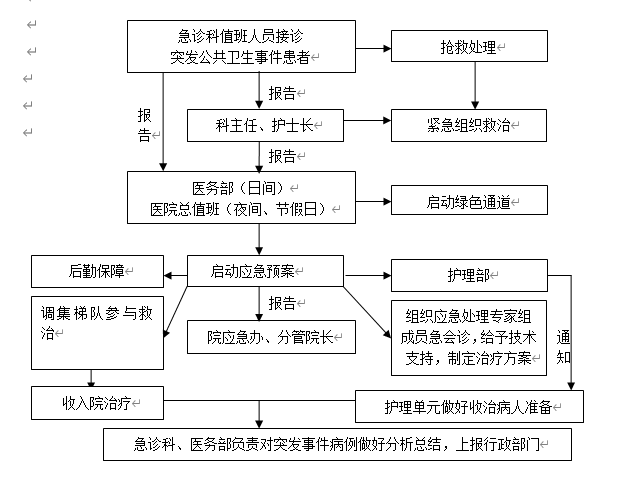 (2)急诊科值班人员接诊突发公共卫生事件患者,接诊医师立即电话报告急诊科主任,接诊护士立即报告急诊科护士长。