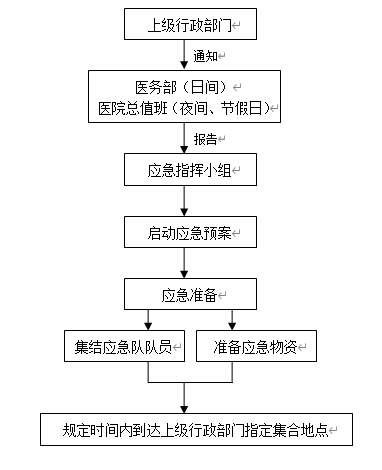 (3)急诊科主任接到报告后立即上报医务部(非正常上班时间向总值班报告,下同),医务部(或总值班)接到报告后立即启动我院“突发公共卫生事件医疗救治应急预案”,通过微信群发布方式,抽调院内、外创伤应急救治队第一梯队队员及救治专家组成员,同时向救治工作领导小组组长、副组长和医院应急办公室报告。