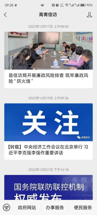 修编了《高青县信访局政府信息主动公开基本目录》,规范公开内容、公开时限、公开主体。按时维护“高青信访”微信公众号,在公众号首页开通“政府网站”“办事服务”“便民查询”栏目,及时公开政府信息,方便群众办事。