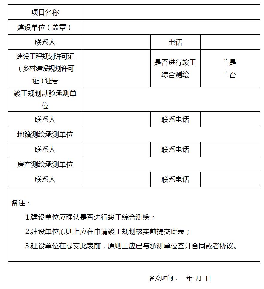 五、本项目在申请建设工程竣工规划核实前,应提交《工程建设项目竣工综合测绘承测单位备案表》,选择是否进行竣工综合测绘。如进行竣工综合测绘,应在提交《备案表》前,明确各测绘业务承测单位,并签订相关合同或协议,实现一次进场测绘。