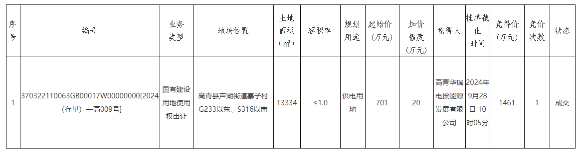 高青县国有建设用地使用权公开出让公告(高自然交告字〔2024〕11号)结果公示