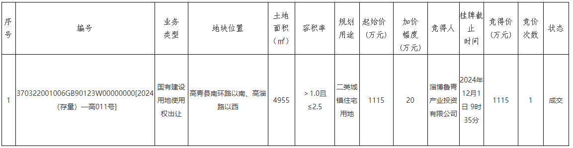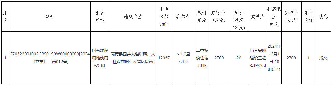 高青县国有建设用地使用权公开出让公告(高自然交告字〔2024〕16号)结果公示